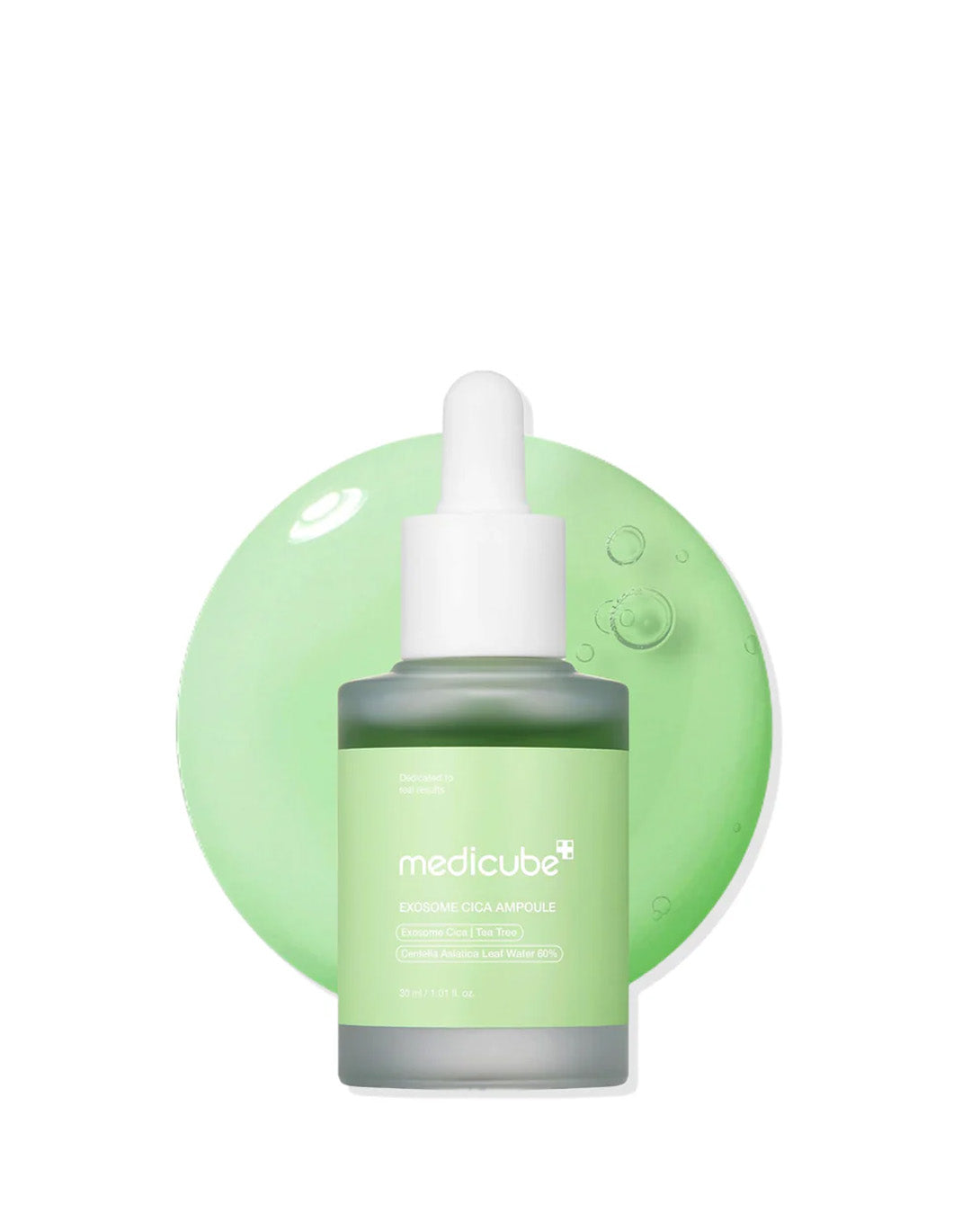 The Medicube Exosome Cica Tea Tree Ampoule is a powerful skin-soothing and repairing serum infused with Exosomes, Centella Asiatica (Cica), and Tea Tree Extract to calm irritation, strengthen the skin barrier, and reduce blemishes.