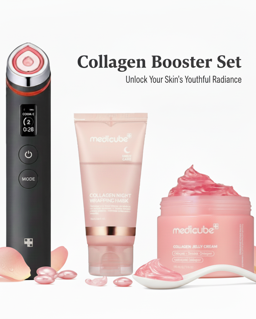 The Medicube Collagen Booster Set is a complete anti-aging skincare solution designed to lift, firm, and deeply hydrate the skin. It combines the AGE-R Booster Pro microcurrent device with collagen-infused skincare products to target signs of aging such as sagging, wrinkles, and dullness, delivering professional-grade results in the comfort of your home.