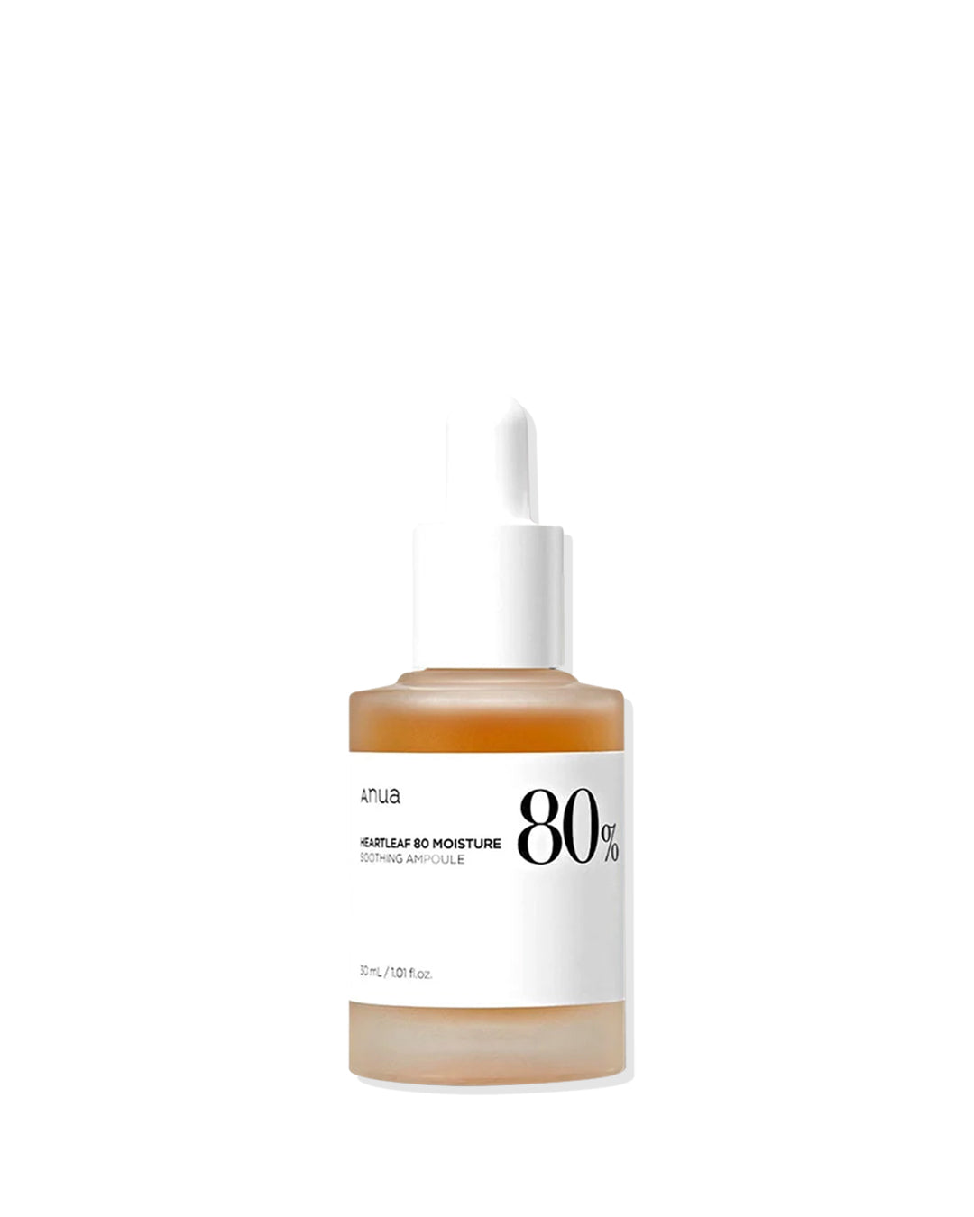 The Anua Heartleaf 80% Moisture Soothing Ampoule is a deeply hydrating and calming serum formulated with 80% Heartleaf Extract to soothe irritation, reduce redness, and strengthen the skin barrier. This lightweight ampoule absorbs quickly into the skin, providing long-lasting moisture and a refreshed, dewy glow.