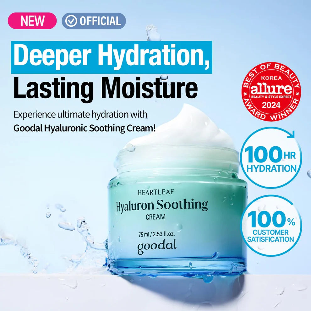The GOODAL Heartleaf Soothing Hyaluron Soothing Cream is a hydrating and calming moisturizer designed to soothe sensitive or irritated skin while providing long-lasting moisture. Enriched with heartleaf extract, hyaluronic acid, and centella asiatica, this cream strengthens the skin barrier, reduces redness, and leaves skin soft, plump, and comfortable. Its lightweight yet creamy texture absorbs quickly, making it ideal for daily use on all skin types, especially sensitive and dry skin.